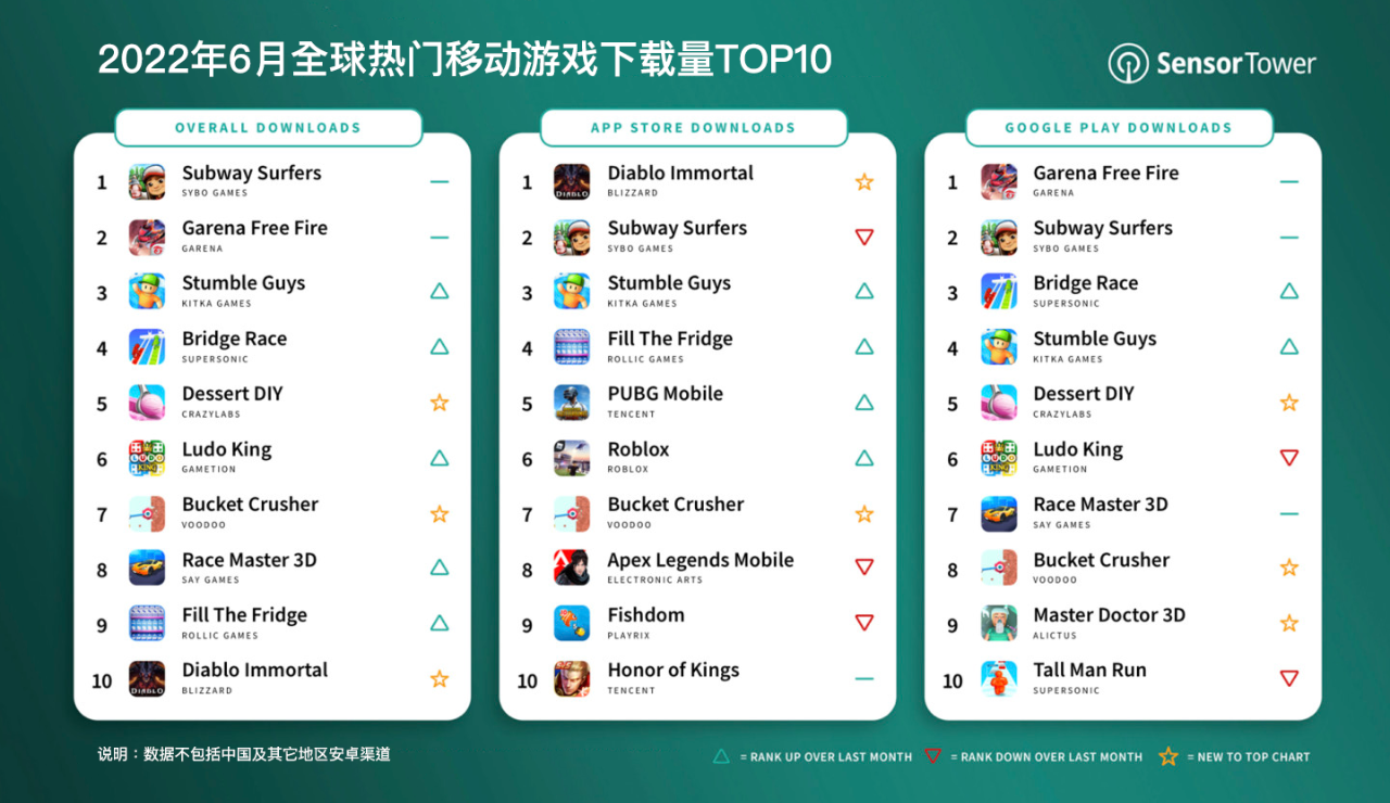 依据Sensor Tower 发布的商铺情报数据,SYBO Games《Subway Surfers》以2600万次下载,位列6月全球移动游戏下载榜榜首,比2021年6月增加63.5%。印度是该游戏榜首大商场,贡献了近14.7%的下载量;其次是美国,占10.2%。(注:下载量仅计算App Store和Google Play,不包括第三方安卓商场)
